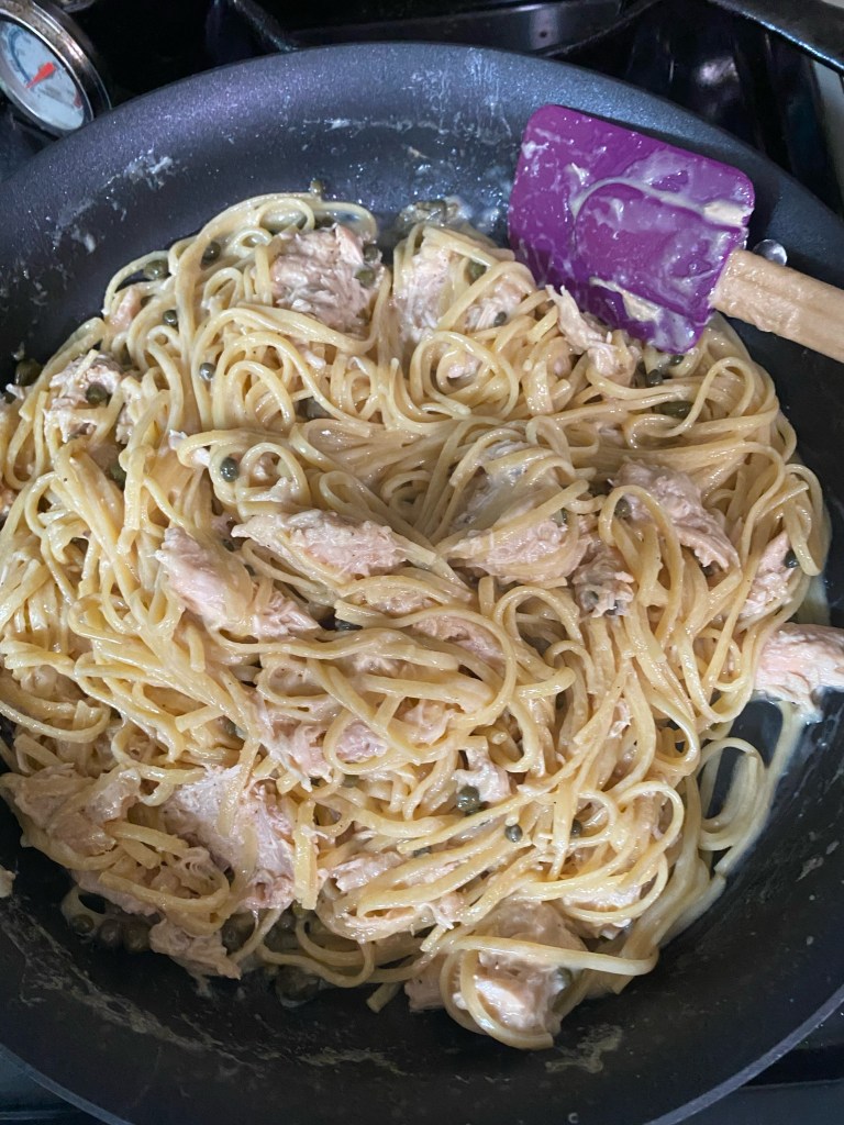 What’s the difference between the recipes? Well, the first is that as we made it over and over again, we learned that we wanted more lemon juice and more capers. We loved those two things and wanted them to pack more of a punch. Then we adjusted some of the measurements in the original recipe to kind of work better with the stove top!