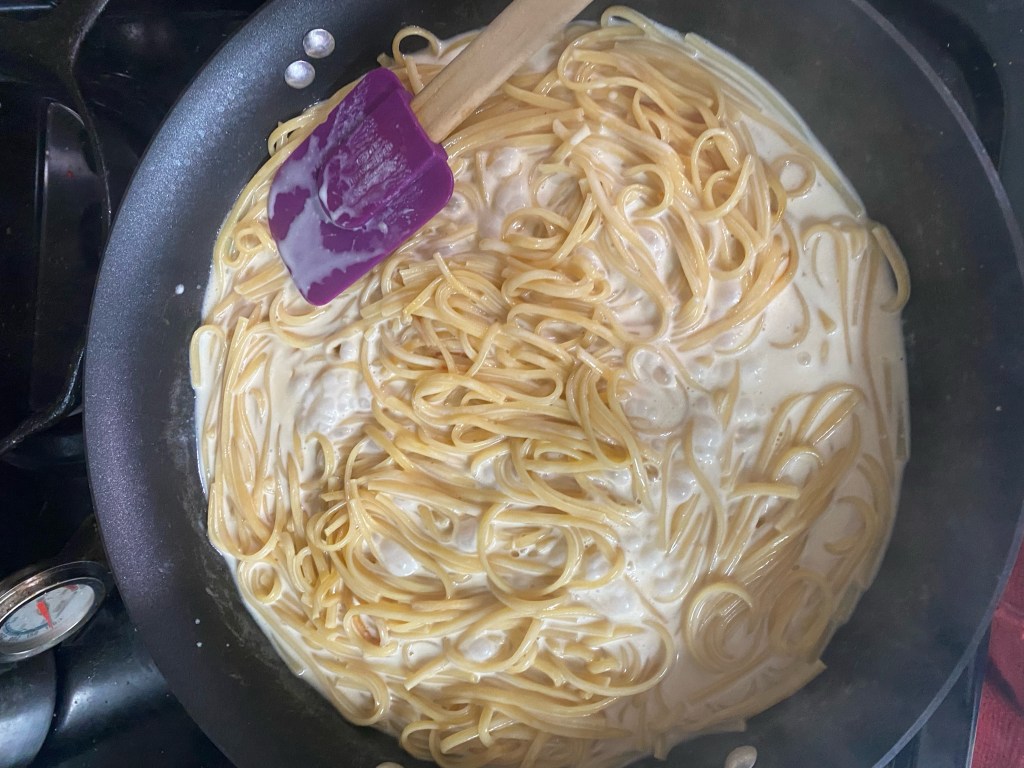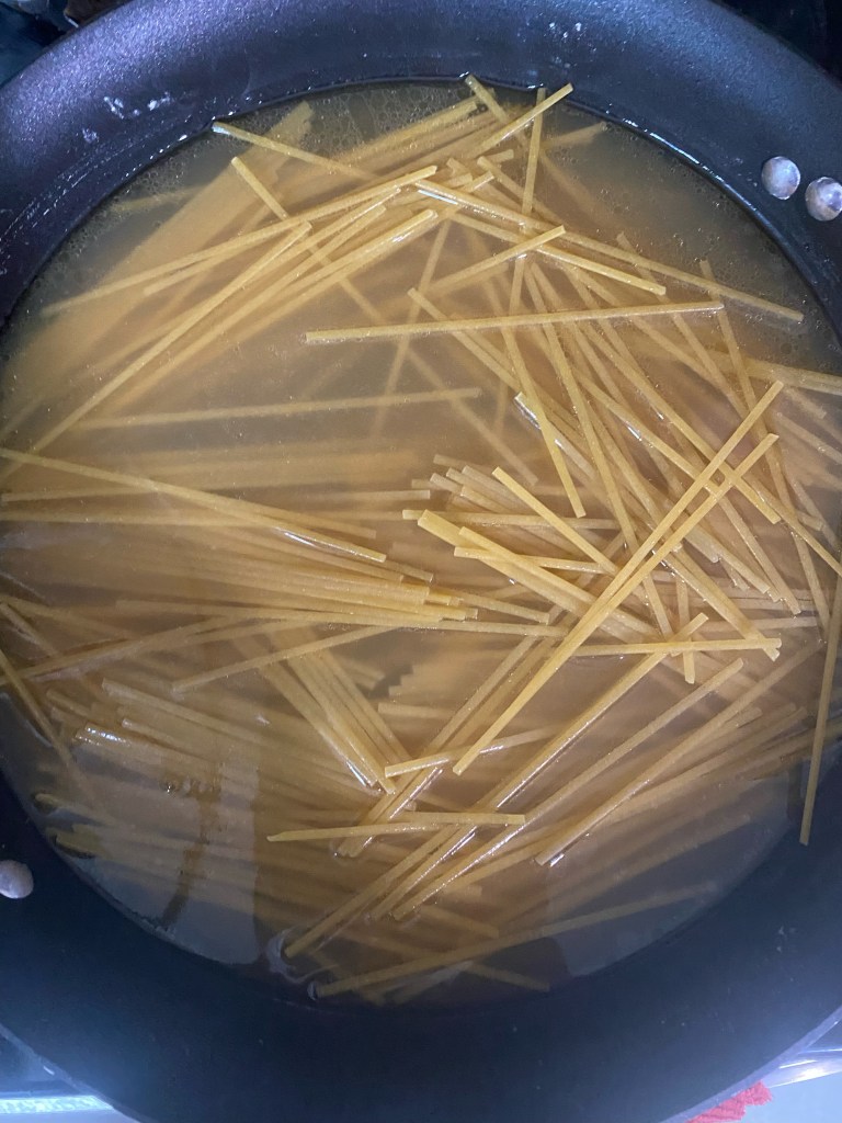 - Put the three cups of chicken broth and the 8 ounces of linguine in a skillet pan (with a lid) and cook on medium. I cover it with a lid. Once it is boiling it is okay to turn it down to a simmer.