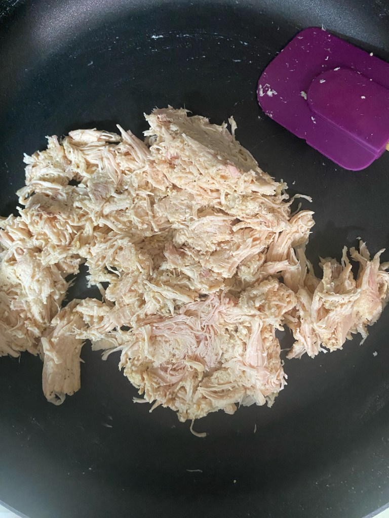 - While the noodles are cooking, put the canned chicken, 1/4 t pepper, 1/2 t salt, and 1/4 cup all-purpose flour in a bowl and mix to combine.